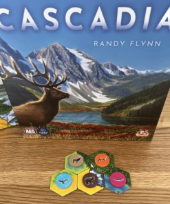 Handgeschilderde houten natuur fiches voor het Cascadia basisspel (25 stuks) en het Cascadia basisspel met Landmarks uitbreiding (40 stuks).